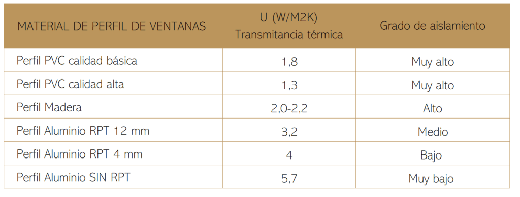 A continuación os dejamos una tabla donde podemos comparar los valores de transmitancia térmica de los perfiles de las ventanas señalado como “U” y que representa el flujo de calor o frío que atraviesa la ventana. Es decir, la capacidad de la ventana para evitar que el frío o el calor entren en casa o que la calefacción acabe más fuera que dentro de nuestra vivienda. A menor transmitancia térmica, mayor aislamiento.