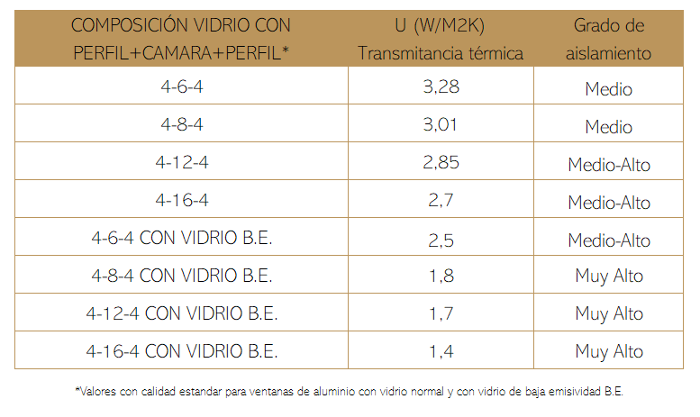 Por ejemplo 4/12/4 significaría 4 milímetros de cristal exterior, 12 milímetros de cámara de aire, 4 milímetros de cristal interior. Os dejamos otra tabla para poder comparar la transmitancia térmica entre ventanas de aluminio con diferentes cámaras y con vidrios especiales de baja emisividad.